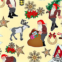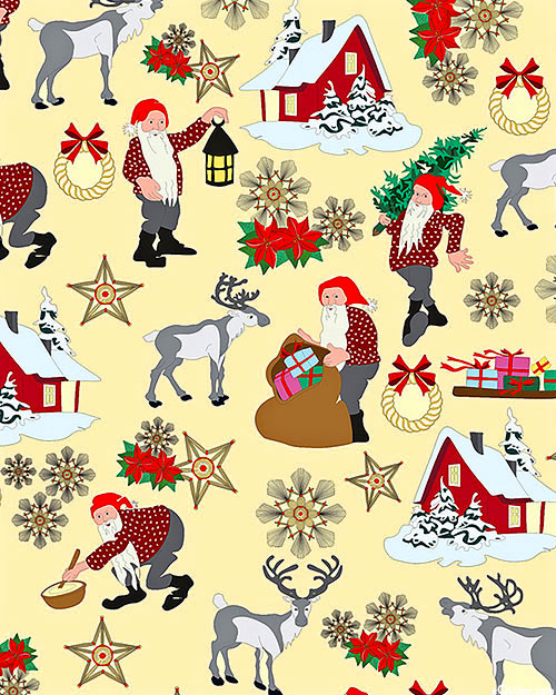 Scenes of Santa Claus and his lovely reindeer are depicted in a charming Norwegian style across this fun and festive design. Taller figures are about 1-1/2", from the 'Norwegian Christmas' collection by Arne & Carlos for Lewis & Irene.