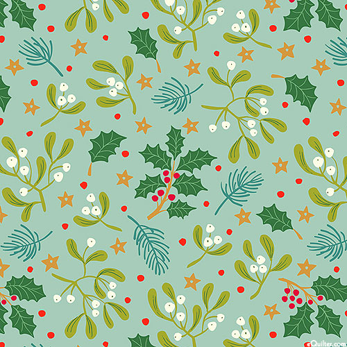 Sprigs of holly and mistletoe are tossed across the design with gingerbread stars scattered in the space between. Larger branches are about 1-1/4", from the 'All Is Bright' collection by Stuart Hillard for Lewis & Irene.