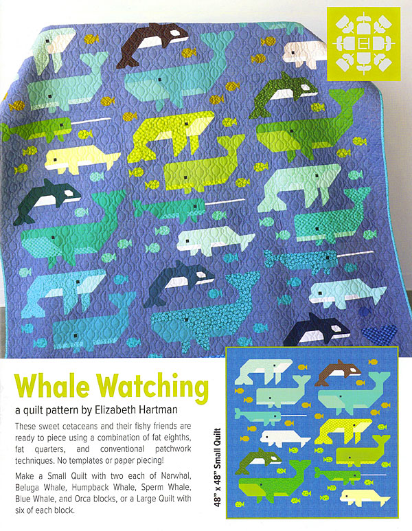 Wales of all kinds mingle with friendly little fish in this quilt pattern using basic piecing techniques! Material Requirements include: (12) fabrics in 2 groups (A & B) for the small quilt and (36) fabrics in 6 groups (A, B, C, D, E and F) for the large quilt. Each color group will be used to make one group of whales and fish and includes the following listed lightest to darkest: Whale Fabric 1 - 1 fat eighth (9" x 21"); Whale Fabric 2 - 1 fat eighth; Whale Fabric 3 - 1 fat quarter (18" x 21"); Whale Fabric 4 - 1 fat quarter; Whale Fabric 5 - 1 fat eighth; Fish Fabric 6 - 1 fat eighth. Additional Fabric Requirements: Eye Fabric - 1/8 yd for small & large quilt; Light Solid detail fabric - 1/8 yd for small and 3/8 yd for large quilt; Background Fabric - 2-3/8 yd for small and 5-5/8 yd for large quilt; Backing Fabric - 3-1/4 yds for small and 5-1/4 yd for large quilt; Binding - 3/8 yd for small and 3/4 yd for large quilt; Batting - 52" x 52" for small quilt and 74" x 90" for large quilt. 'Whale Watching' quilt pattern by Elizabeth Hartman. Finished sizes: Small Quilt - 48" x 48", and Large Quilt - 70" x 86".