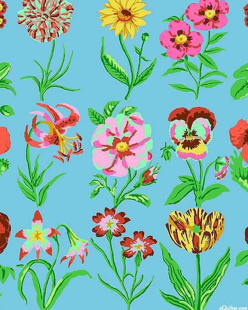 A lush landscape of flourishing flowers coalesce to create a captivating garden gala of texture and tone. Taller floral stems are about 6", 'Flower Studies' from the 'Kaffe Fassett Collective February 2025' collection by Kaffe Fassett for Free Spirit.