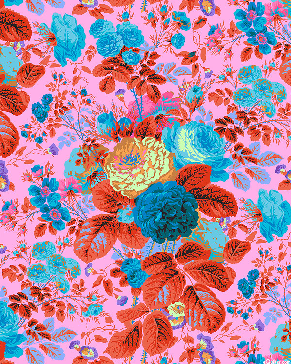 A grand bouquet of garden roses tumbles over a solid ground in this splendid display of blooms and leaves. Filled with rich colors, this large scale design has all the romance of the old fashioned rose blazing with contemporary hues. Larger flowers are about 5", 'Gradi Floral' from the 'Kaffe Fassett Collective February 2025' collection by Kaffe Fassett for Free Spirit. Because of the large repeat, please order a minimum of 1 yard to receive a full repeat of the design.