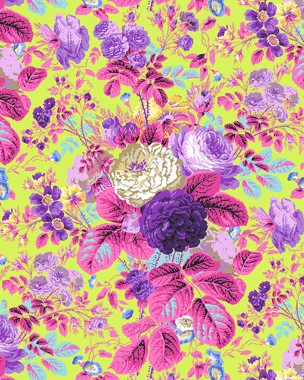 A grand bouquet of garden roses tumbles over a solid ground in this splendid display of blooms and leaves. Filled with rich colors, this large scale design has all the romance of the old fashioned rose blazing with contemporary hues. Larger flowers are about 5", 'Gradi Floral' from the 'Kaffe Fassett Collective February 2025' collection by Kaffe Fassett for Free Spirit. Because of the large repeat, please order a minimum of 1 yard to receive a full repeat of the design.
