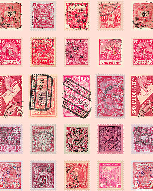 A vintage variety of postal stamps come together in a charming collage. Larger stamps are about 1", 'Pink Stamps' from the 'Tim Holtz Palette Pink' collection by Tim Holtz for Free Spirit.