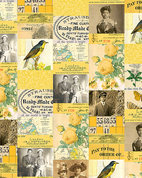 A vintage variety of photographs, letters, and other documents come together in a charming collage. Larger photos are about 2-1/2", 'Yellow Collage' from the 'Tim Holtz Palette Yellow' collection by Tim Holtz for Free Spirit.
