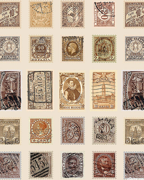 A vintage variety of postal stamps come together in a charming collage. Larger stamps are about 1", 'Neutral Stamps' from the 'Tim Holtz Palette Neutral' collection by Tim Holtz for Free Spirit.