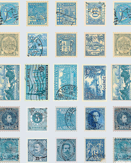 A vintage variety of postal stamps come together in a charming collage. Larger stamps are about 1", 'Blue Stamps' from the 'Tim Holtz Palette Blue' collection by Tim Holtz for Free Spirit.