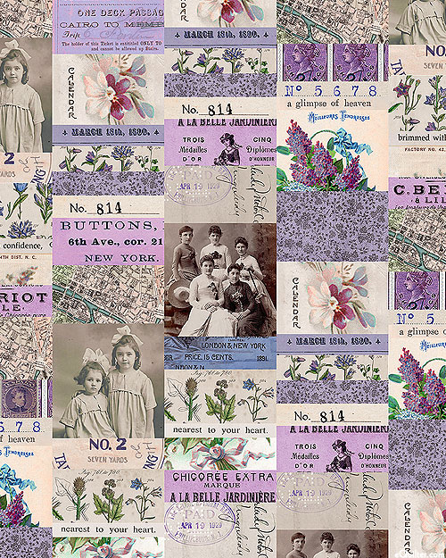 A vintage variety of postal stamps, photographs, and other documents come together in a charming collage. Larger photos are about 2-1/2", 'Purple Collage' from the 'Tim Holtz Palette Purple' collection by Tim Holtz for Free Spirit.