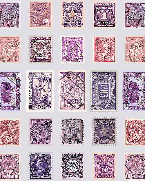 A vintage variety of postal stamps come together in a charming collage. Larger stamps are about 1", 'Purple Stamps' from the 'Tim Holtz Palette Purple' collection by Tim Holtz for Free Spirit.