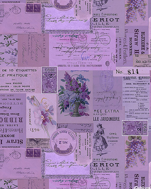 A vintage variety of postal stamps, letters, and other documents come together in a charming collage. Larger posters are about 4", 'Purple Ephemera' from the 'Tim Holtz Palette Purple' collection by Tim Holtz for Free Spirit.