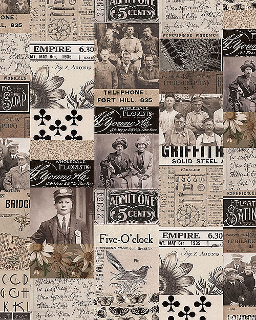 A collage of vintage photographs and engineering schematics lend a retro charm to the design. Larger photos are about 2-1/2", 'Charcoal Collage' from the 'Tim Holtz Palette Charcoal' collection by Tim Holtz for Free Spirit.