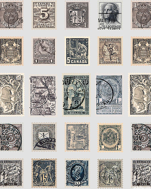 A vintage variety of postage stamps are scattered across the design. Larger stamps are about 1", 'Charcoal Stamps' from the 'Tim Holtz Palette Charcoal' collection by Tim Holtz for Free Spirit.
