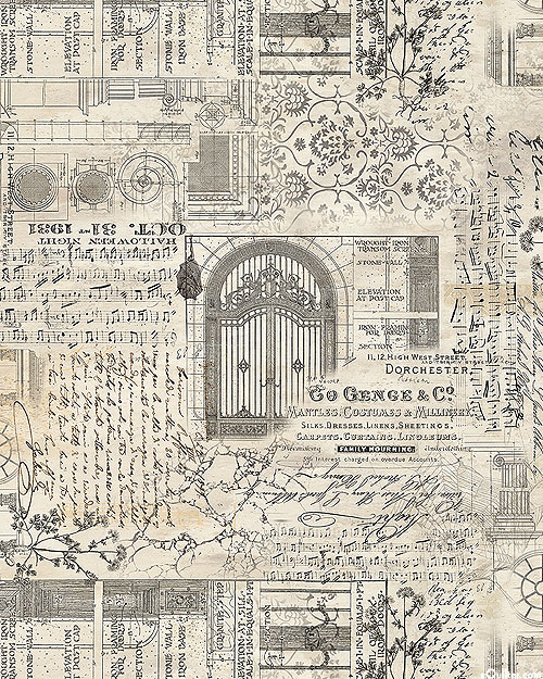 A vintage variety of Halloween-themed motifs come together in a festive collage featuring mansion blueprints, sheet music, faded documents, and more! Larger illustrations are about 3-3/4", 'Halloween Remnants' from the 'Tim Holtz Palette Seasonal' collection by Tim Holtz for Free Spirit.