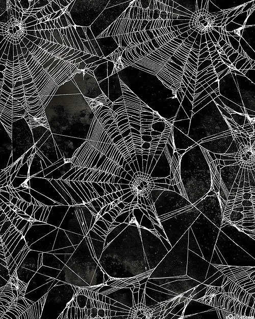 A mesh of spooky spiderwebs are depicted stands out against a mottled background of smokey textures in this fun and festive Halloween-themed design. Larger spiderwebs are about 3-1/2", 'Halloween Entangled' from the 'Tim Holtz Palette Seasonal' collection by Tim Holtz for Free Spirit.