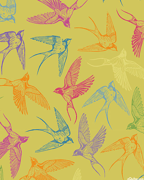 As if stamped onto the fabric itself, a colorful toss of swallows soaring through the air are scattered across the design. Larger birds are about 4-1/2", 'Swallows' from the 'Findings' collection by Valori Wells for Free Spirit.