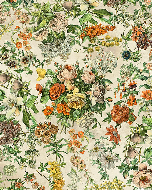 A lush landscape of flourishing flowers coalesce to create a captivating garden gala of texture and tone. Please prewash and allow for up to 7% shrinkage. 108" wide quilt backing, larger flowers are about 2", from the 'Botanical 108"' collection by Tim Holtz for Free Spirit.