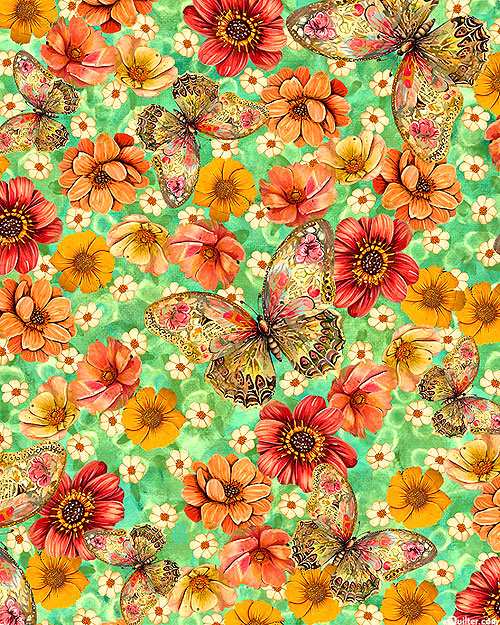A lush landscape of flourishing flowers and beautiful butterflies coalesce to create a captivating garden gala of texture and tone. Digitally printed, larger butterflies are about 3", from the 'Enchanted Canopy' collection by JK Stewart for Blank Textiles.