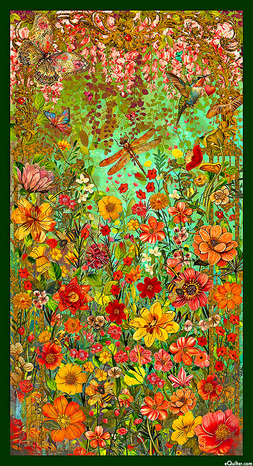 A lush landscape comes to life as butterflies, hummingbirds, ladybugs, and dragonflies flutter within a verdant flower grove in this painterly panel. Digitally printed, 24" panel, from the 'Enchanted Canopy' collection by JK Stewart for Blank Textiles.