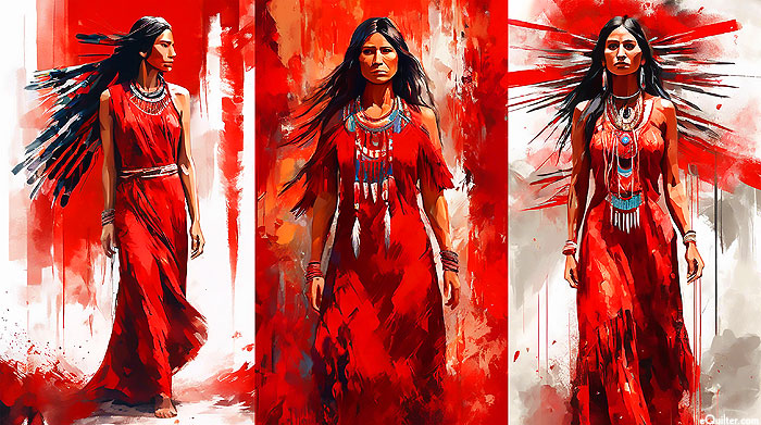 This painterly panel depicts a trio of Native American women dressed in stunning traditional dresses. Digitally printed, 24" panel, from the 'Sacred Sisters' collection by Nadine Fortier for Northcott Fabrics. A percentage of sales will be donated in support of MMIWG2S+