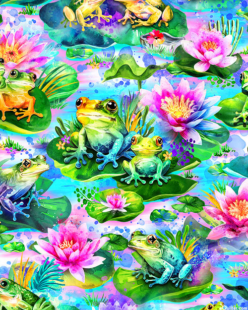 A friendly gathering of adorable rainforest frogs sitting on lily pads are depicted across this energetic design. From the 'Hip Hop!' collection by Oasis Fabrics.