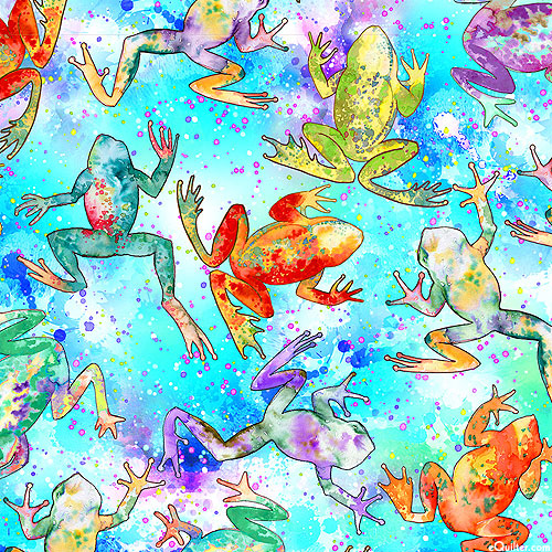 Colorful tree frogs hop to and fro against a painterly background as dappled spatters articulate the space between. From the 'Hip Hop!' collection by Oasis Fabrics.