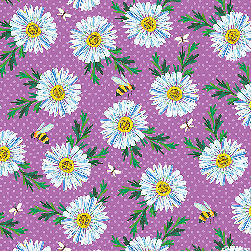 Against a polka-dotted background, honeybees buzz busily between a lush scatter of daisy blossoms, lending a natural charm to this elegant design. Larger flowers are about 1", 'Daisy Scatter' from the 'A Wildflower Heart' collection by Katie Daisy for Benartex Fabrics.