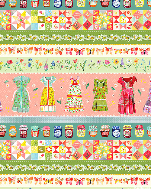 Layered stripes contain a blissful variety of summery motifs including flowery sundresses, colorful butterflies, quilted patchworks, garden blossoms, and jars of honey & jams. Wider stripes are about 5-1/2", 'A Prairie Heart Stripe' from the 'A Prairie Heart' collection by Katie Daisy for Benartex Fabrics.