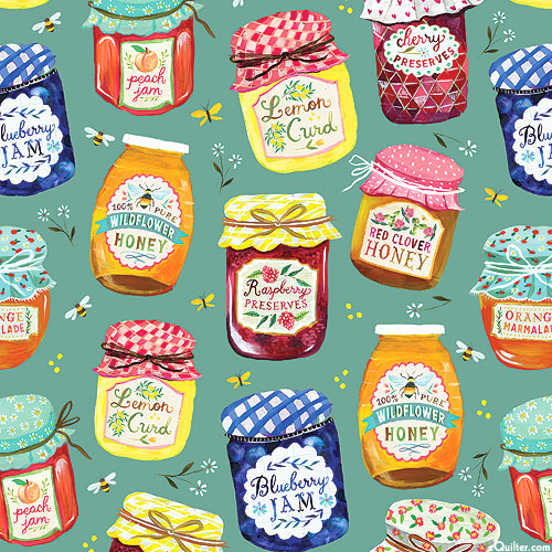 Jars of jam and honey are scattered against a solid background with small honeybees and butterflies fluttering in the space between. Larger jars are about 1-3/4", 'Jam Jars' from the 'A Prairie Heart' collection by Katie Daisy for Benartex Fabrics.