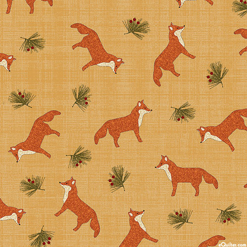 Cute little foxes are scattered against a solid background with small sprigs of pine scattered in the space between. Larger foxes are about 1-1/2", 'Fox Field' from the 'A Walk In The Forest' collection by Cheryl Haynes for Benartex Fabrics.