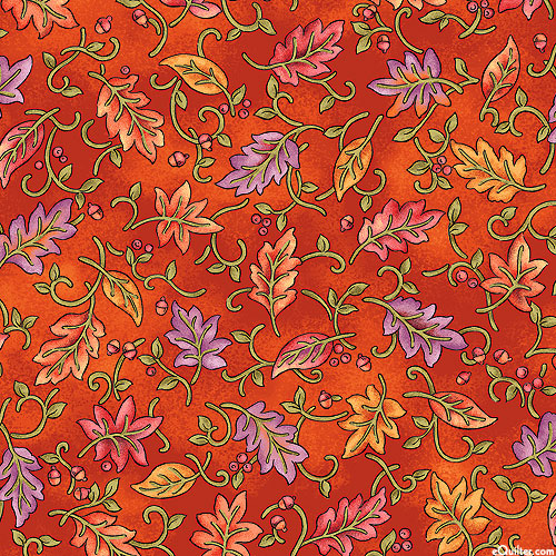 A lush canopy of leafy fronds is articulated with small berries, lending an Autumnal allure to this harvest-themed design. Larger leaves are about 1-3/4", 'Dancing Leaves' from the 'Autumn Breeze' collection by Nancy Halvorsen for Benartex Fabrics.