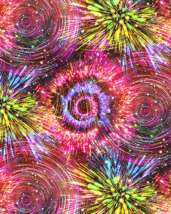 A dazzling display of fireworks sparkle brilliantly against a starry night sky. Digitally printed, larger circles are about 6-1/4", from the 'Galaxy' collection by Oasis Fabrics.