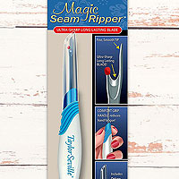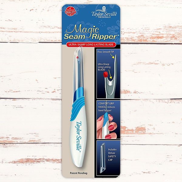 This seam ripper has an ultra sharp long lasting blade with a comfort grip handle that reduces hand fatigue. The fine smooth tip gets under stitches easily and includes deluxe safety cap. 'Magic Seam Ripper' by Taylor Seville.