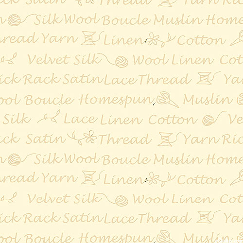 Words related to the love of sewing are written across this charming blender. Taller text is about 1/4", text runs from selvedge to selvedge, 'Script' from the 'Stash Happy' collection by Jeni Gaston for Marcus Fabrics.