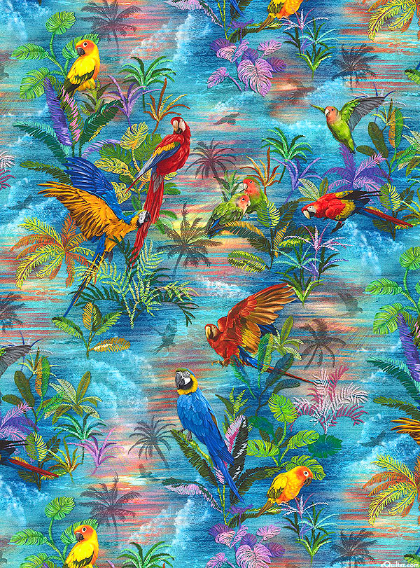 Parrots show off their brilliant colors as they take flight through the rain forest. Larger parrots are about 4", from the 'Parrot Isle' collection by Oasis Fabrics.