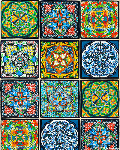 A colorful array of large scale blocks inspired by Mexican tile work display elaborate designs composed of garden designs and geometric patterns, all in a palette of traditional colors. Southwest tile frames are about 4 1/2", sold by the 24" panel, from the 'Fiesta' collection by Elizabeth's Studio.