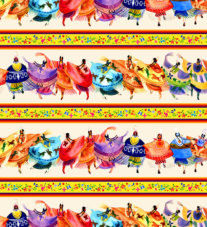 Stripes of Native dancers are intermingled with delicate wildflowers. Wider stripes are about 4 1/2" and run the length of the fabric, from the 'Shawl Dancers' collection by Daniel Ramirez for Elizabeth's Studio.