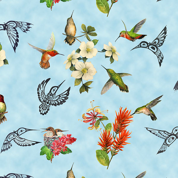 In this mixture of real and unreal, life and art meld together to form a whole new perception of the world. Realistic hummingbirds and their Pacific Northwest styled icons flit among the flowers. Larger hummingbirds are about 2", from the 'Hummingbird Vision' collection by Sue Coleman for Elizabeth's Studio.
