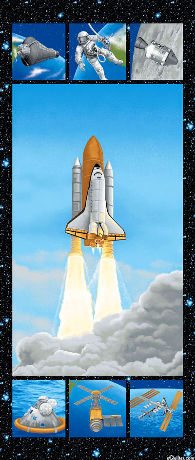 A space shuttle blasts off leaving a cloud of smoke behind as it climbs into the sky in the main frame of this large panel. Six smaller frames show snapshots from space of an astronaut, the space station, and the landing capsule; all bordered by a starry night sky. 58" wide fabric, 24" panel, main frame is about 36", panels have 7 frames, from the 'I Want My Space' collection by Benartex.