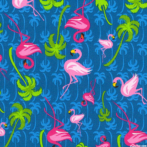 Flamingos balance on one leg in this graphic tropical fabric. Taller flamingos are about 2-1/2", by Fabric Traditions.