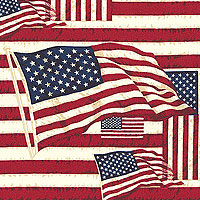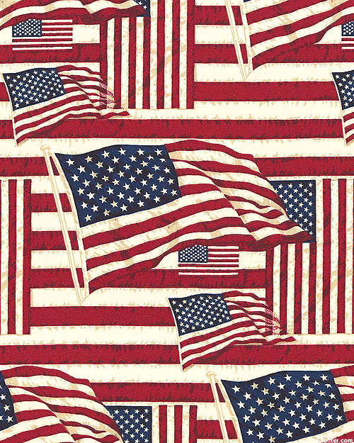 The tea that stains these American flags represents the historical event known as the Boston Tea Party. Larger flags are about 6-1/2", 'Flags On Tea Stain' by Fabric Traditions.