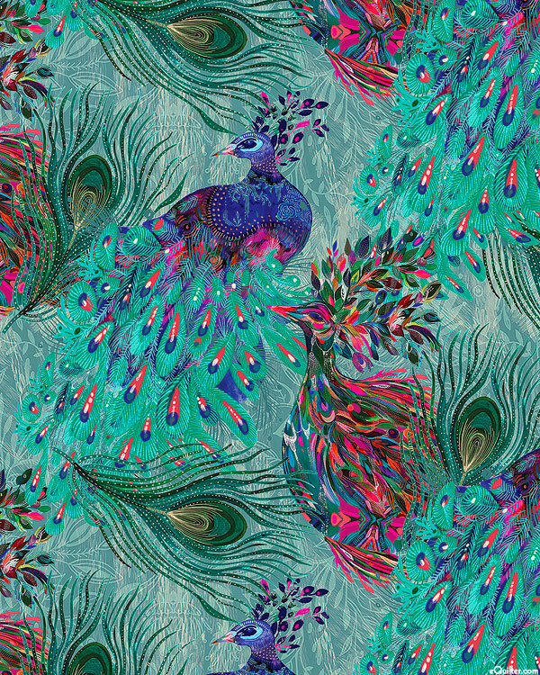 Peacocks exuding unmatched elegance in the brilliant patterns along the length of their plumage rest gently within a vibrant garden. Larger peacocks are about 10", 'Affinity Peacock' from the 'Affinity' collection by Danielle Duer for Benartex Fabrics.