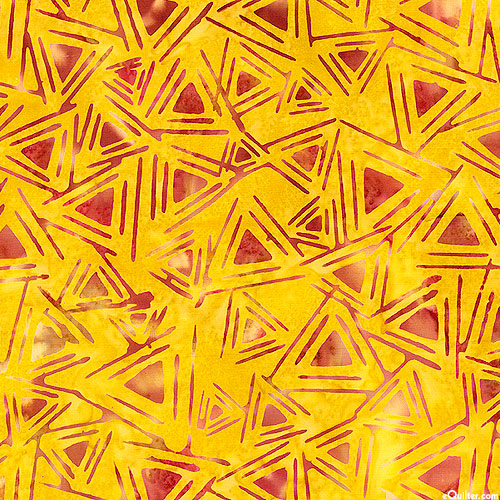 Tossed triangles are depicted in vivid hues within mottled batik textures. Batik, larger triangles are about 2", from the 'Good Vibrations' collection by Nebraska Quilt Company for Riley Blake Designs.