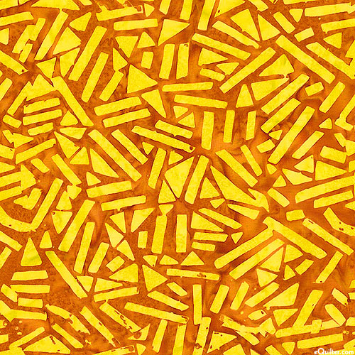 Tossed shapes are depicted in vivid hues within mottled batik textures. Batik, larger triangles are about 1-1/2", from the 'Good Vibrations' collection by Nebraska Quilt Company for Riley Blake Designs.