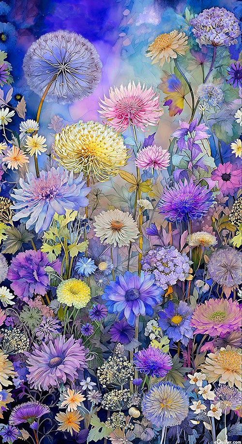 A lush landscape of flourishing flowers coalesce to create a captivating garden gala of texture and tone. Digitally printed, 24" panel, from the 'Mystic Meadow' collection by Timeless Treasures.