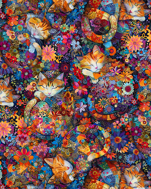 A cute cast of kitties are covered in the verdant foliage of a flowery forest in this cute and cuddly print. Digitally printed, 'Calico Cat Floral' from the 'Calico Cat' collection by Timeless Treasures.