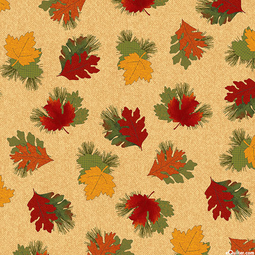 A lush canopy of leafy fronds lends an Autumnal allure to this harvest-themed design. Larger leaves are about 1-1/4", 'Forest Leaves' from the 'A Walk In The Forest' collection by Cheryl Haynes for Benartex Fabrics.