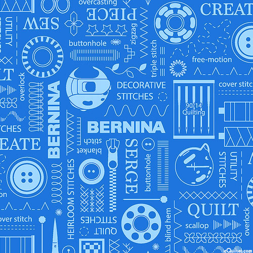 Larger objects are about 1", 'Bernina Stitches' from the 'Bernina Circa 2025' collection by Benartex Fabrics.