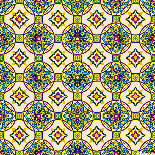 Medallions are about 3/4", with gold metallic, 'Tile Medallion' from the 'Shangri-La' collection by Painted Sky Studio for Benartex Fabrics.