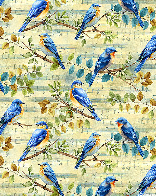 Small birds perched on thin tree branches are depicted in front of a background of faded sheet music playing the melody of birdsong. From the 'Awakenings' collection by Jan Mott for Henry Glass & Co.