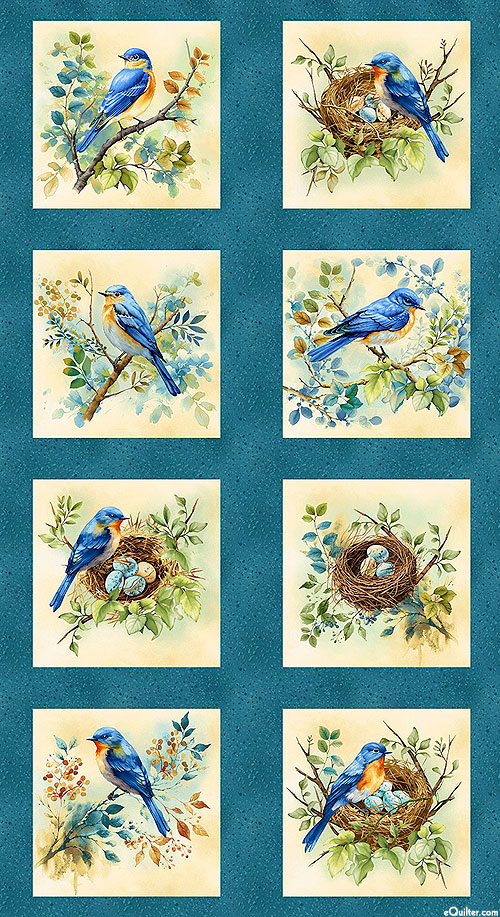 Panel blocks contain imagery of small birds perched on thin branches and keeping watch over their eggs kept safe in a nest up high in the trees. 24" panel, from the 'Awakenings' collection by Jan Mott for Henry Glass & Co.