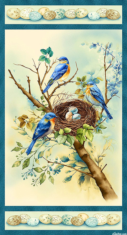 In this panel, a flock of birds keeps watch over their eggs kept safe in a nest up high in a tree branch. 24" panel, from the 'Awakenings' collection by Jan Mott for Henry Glass & Co.